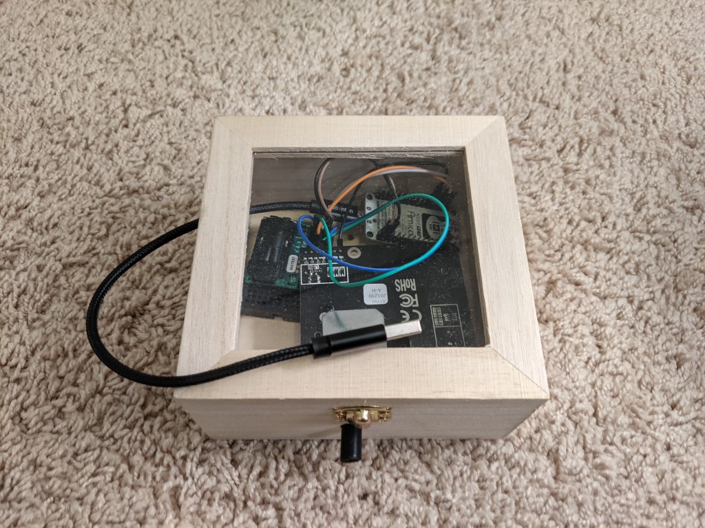 Sensor placed inside a wooden housing. This sensor measures particulate matter and CO2 while sending data through the internet.