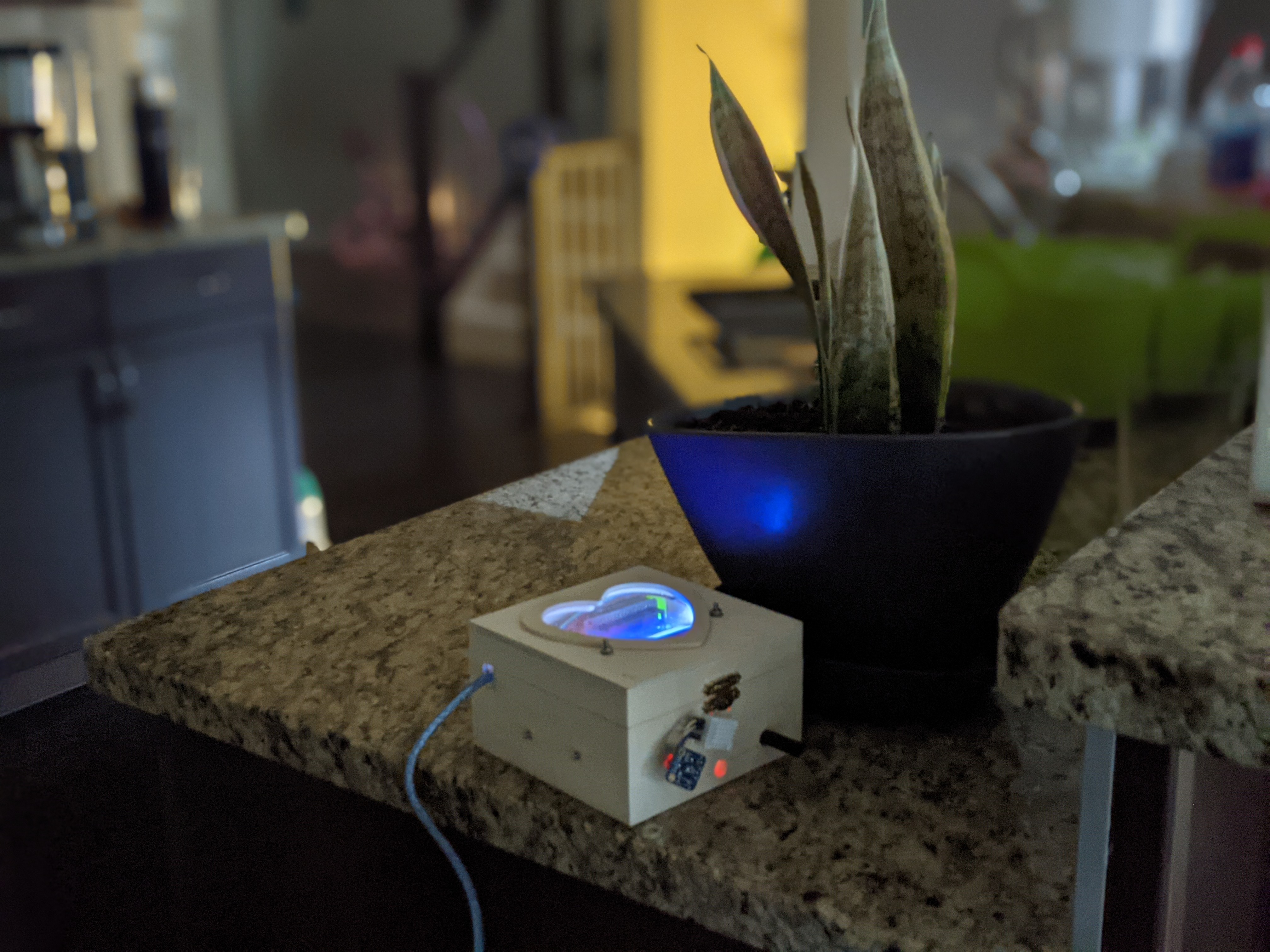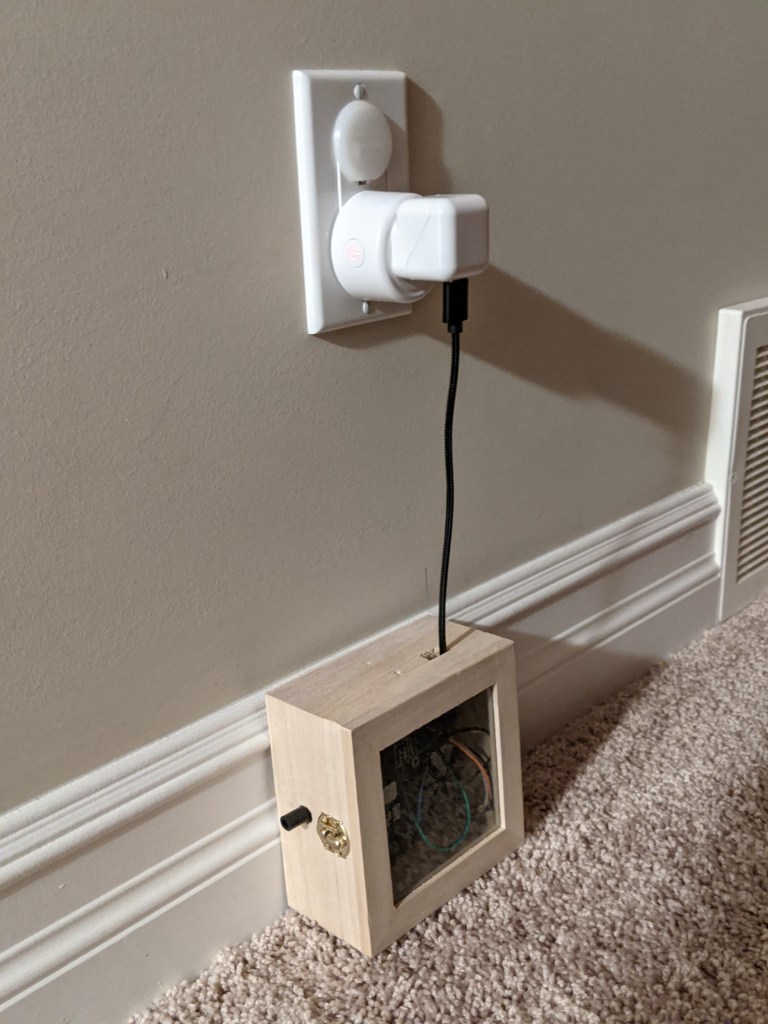 An example setup. The sensor is connected to a standard USB charger powered by a smart plug. The smart plug allows the research team to reboot the sensor remotely.